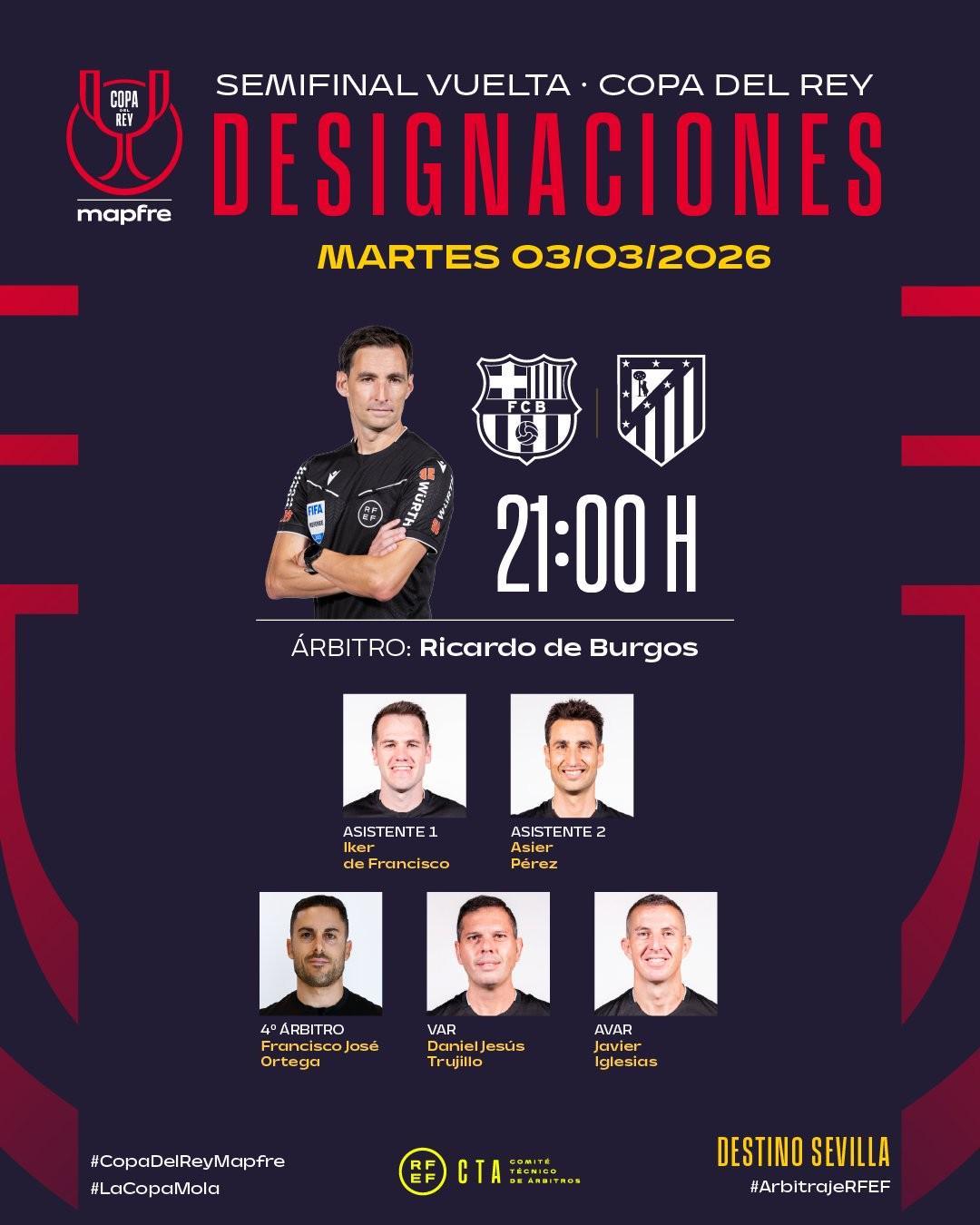 北京时间3月2日,西班牙足协官方公布了国王杯半决赛次回合,巴萨主场对阵马竞的裁判组名单,布尔戈斯担任主裁判。首回合马竞主场4-0大胜巴萨。